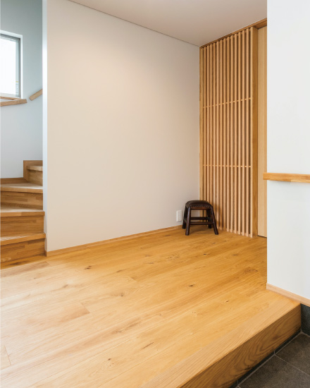 玄関ホールは家の顔であり、送る・迎えるという大切な空間のため、デザインは特に力を入れています。リビングに続く造作オリジナル建具は床材と素材を合わせ、オーク材で制作。造作下駄箱は家具職人が作ります。
